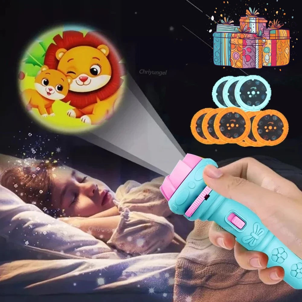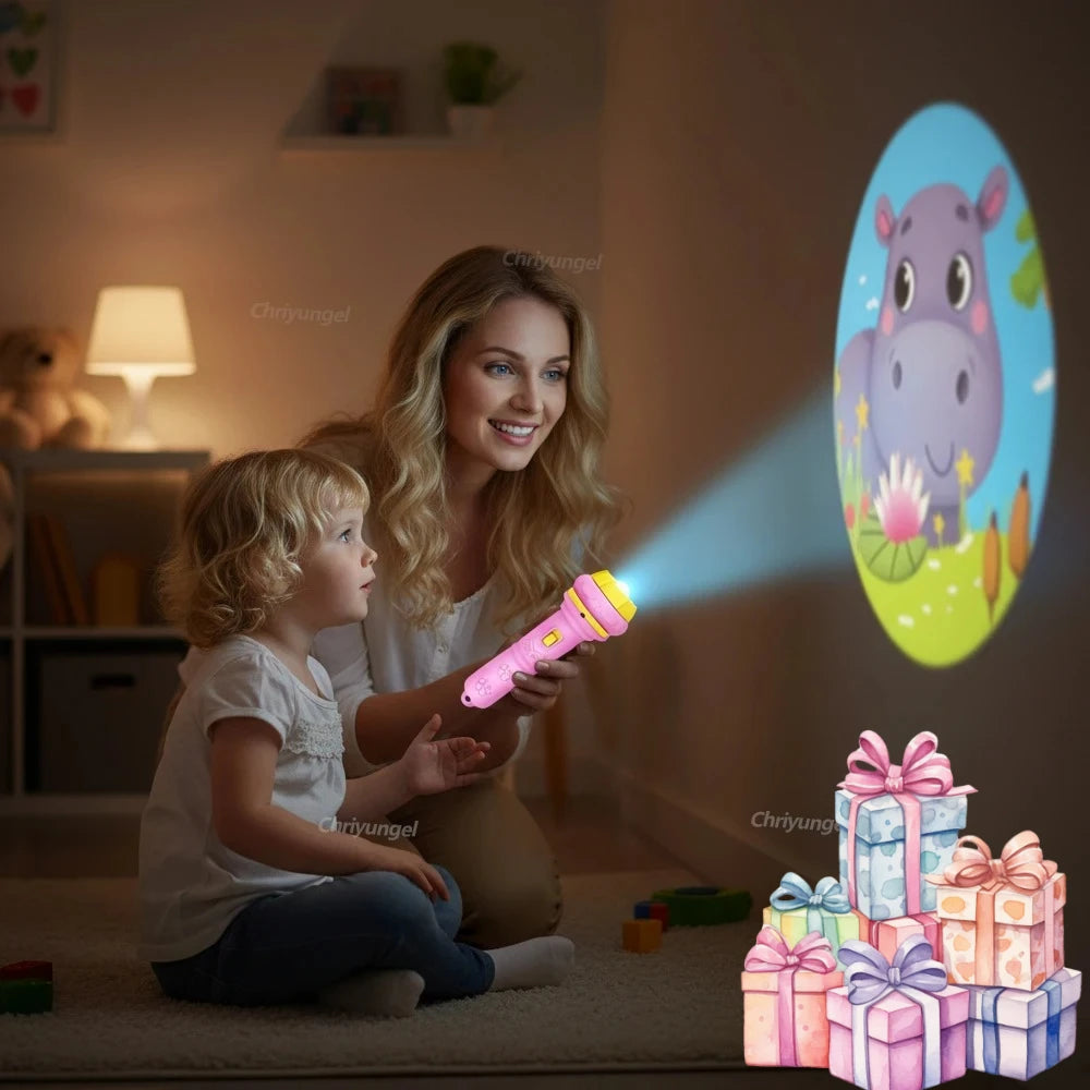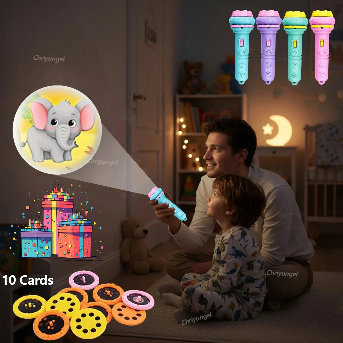 Transform bedtime into a magical storytelling experience with this creative projection flashlight featuring 80 colorful cartoon images across 10 slide cards. Simply insert a card, turn on the flashlight, and project enchanting scenes on walls or ceilings to spark imagination and make stories come alive. Compact, portable, and easy for little hands to use, it's perfect for bedtime routines, camping trips, or quiet play. Includes batteries and comes in a set of 2 flashlights—ideal for ages 3-6!